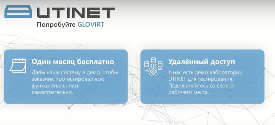 There are two ways to do this. The first option: we will give you the distribution for a month, and you or the customer can install it on your resources, your servers, and test everything in your environment. The second option: we can provide you with access to our servers. We have our own demo laboratory. And we will just give you a login and password, you will be able to study the interface, see functionally what GLAVIRT can do in general. This will allow customers to make informed purchasing decisions. So, it will probably be easier for us to demonstrate all the advantages of the system.
