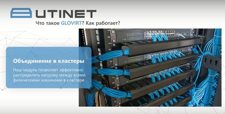 This is necessary for fault tolerance. That is, if one of the servers fails or some board in it burns out, or something else, then the rest of the servers pick up the entire load, and the client's infrastructure continues to work. This, probably, will not surprise anyone now, everyone has it. And what distinguishes GLAVIRT? This is our load balancing module. We have developed a module that evenly distributes all resources to all servers, which increases performance, servers heat up less and everything works faster as a result.