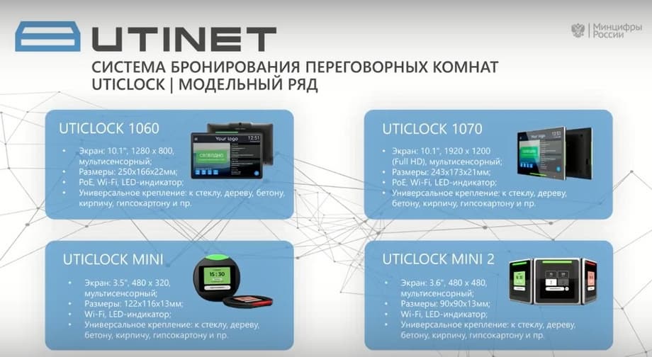 UTICLOCK MINI has already been discontinued. But a small amount remains in stock. Three and a half inch tablet. It has LED indication. It is slightly less functional than 1060 and 1070. It is not possible to deeply book a negotiation room by days and weeks from it, for example. It only has pre-installed 15 minutes, 30 minutes and one hour. It also has an NFC chip.