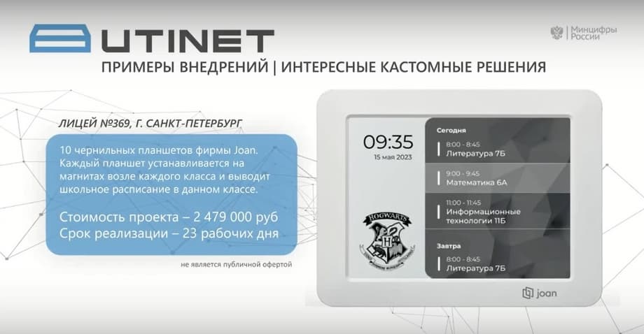 Here is an example. We have optimized the software for working with a black and white tablet, with an ink one at the request of the customer. Light customization is possible by itself, that is, the customer can independently change the logo, change the wallpaper. If you need something deep, then you can contact us, we are engaged in this. Here is the cost of the project 2,479,000 rubles and the implementation period - 23 working days. This was the price for the entire project of ten ink tablets.