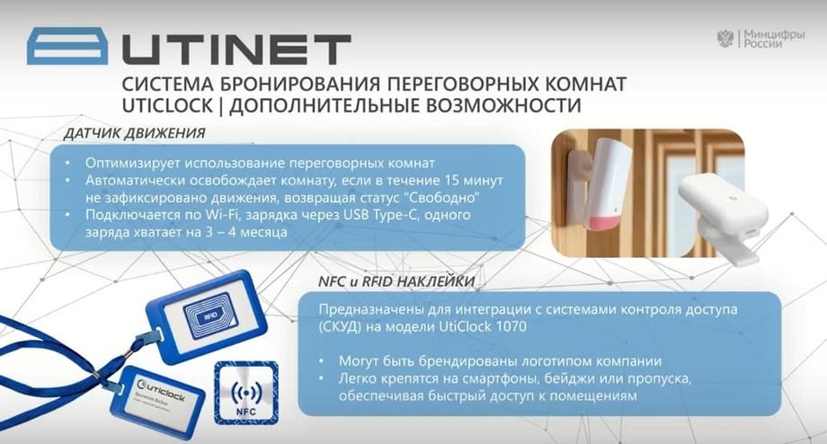 Example of practical application. Let's say you see that there is a free negotiation room and the event will start in 15 minutes. And you need to hold a short meeting. You come in, the motion sensor triggers and changes the indication on the panel, shows that the negotiation room is occupied. And this will exclude some not very funny story when someone can suddenly burst into the negotiation room. And along with this, it shows, if, for example, you have booked an event, but you have not come to it, it will show after a while that the room is free and you can use it. That is, it will cancel the event. NFC and RFID stickers are designed for integration with access control systems, and you can brand company logos, they are attached to smartphones, badges or passes, and provide quick access to the premises.