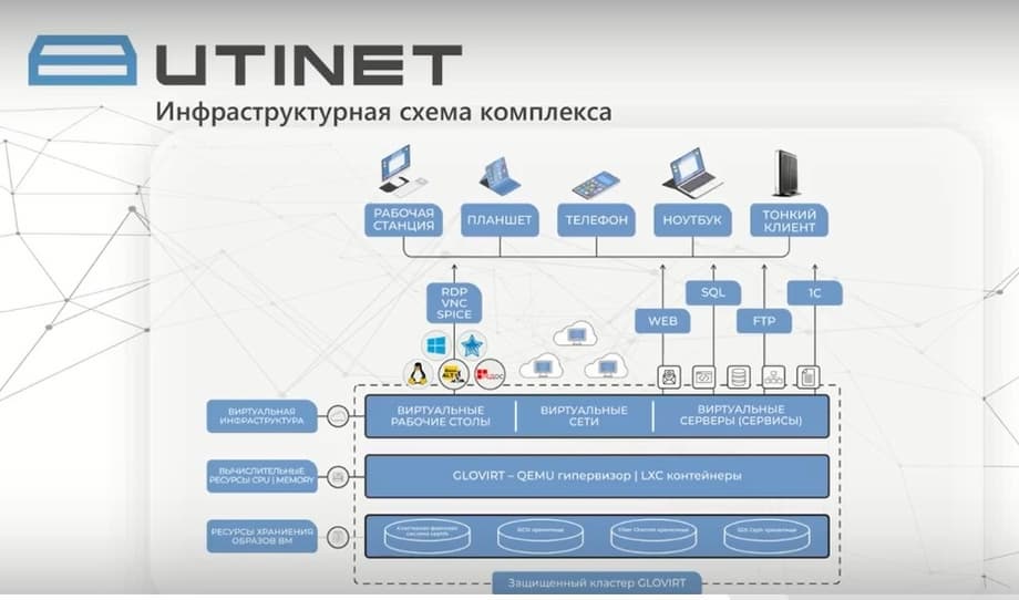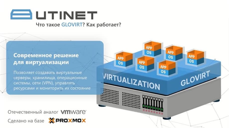 GLOVIRT is installed on the server. And on top of it you can install most popular operating systems with your applications. You can not only create virtual servers, you can also create data storage systems, configure networks, including private VPN networks. And all this with GLOVIRT you can manage, monitor the status of all systems. This is our domestic analogue of VMware, which we made on the basis of the no less popular Proxmox.