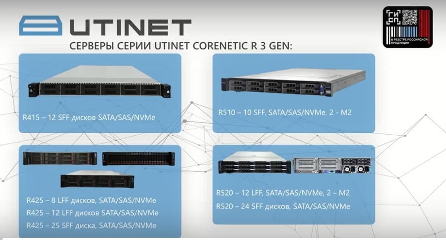 We have a fairly wide range of third-generation server platforms with the possibility of flexible modernization to meet the needs of the customer. In our portfolio, one and two units. These are R415 and R510 models. A feature of the R415 model is 12 NVMe disks, 32 slots of RAM. The R510 model supports 10 disks, 8 of which are NVMe, also 32 slots of RAM, and there is support for two M2 disks.