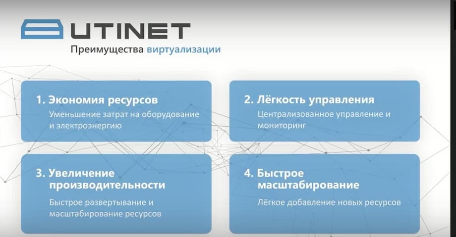 Firstly, it is, of course, saving resources. A company may have one corporate portal, mail, database, and all this should run on some machines. When a client has one server with other virtual servers, this is much more efficient. One server instead of three is always more profitable than buying a separate server for each system and deploying this or that resource on it. Secondly, it is ease of management, namely centralized management of all this. That is, everything is managed from one computer, and even from one program, from one window. That is, virtualization allows the administrator to immediately monitor and manage all virtual machines through one program. And, thirdly, it is an increase in productivity. If, for example, the load suddenly increases on "1C", then you can quickly add resources to the corresponding virtual machine without resorting to purchasing new equipment. That is, literally in a couple of mouse clicks, we increase the power of the virtual server with "1C", and everything starts working faster for us. And the last thing is fast scaling. If a company has some new direction, you now need to deploy another CRM system or, for example, a website, then creating a virtual server is always faster than buying a new one.