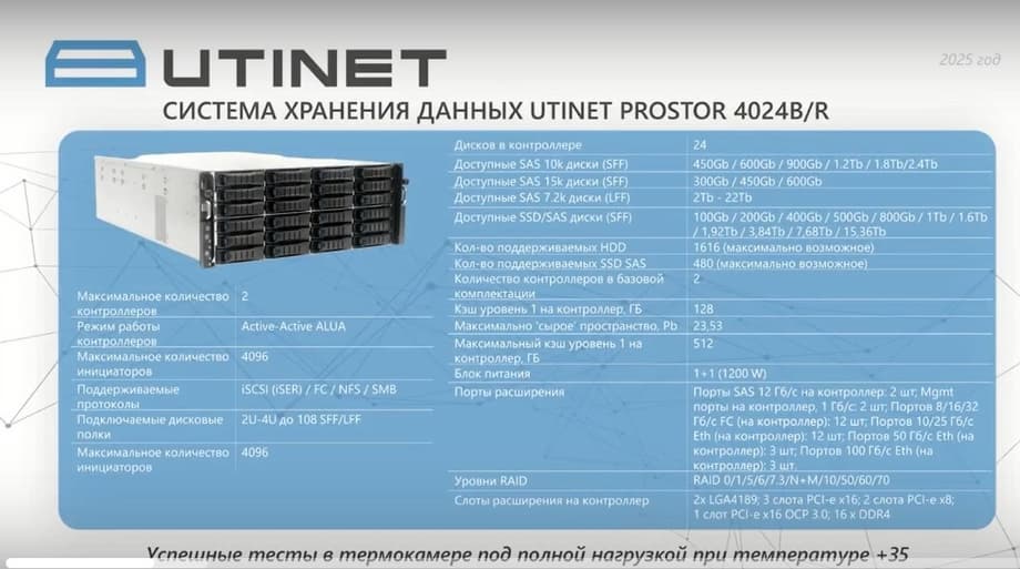 Midrange data storage system. Two units, two controllers. In two units, our chassis allows you to install 24 drives. We also submitted several iterations of the storage system under one registry entry, that is, it is just a head, a head with shelves for 24 disks and with various shelves up to 96 disks, it is possible to expand. Since this is all under one registry entry, you do not need to purchase shelves using a separate procedure. At the moment, there are no similar solutions on the market, such as two units, two controllers and Active-Active. This solution allows us to protect tenders and to operate very flexibly. In the storage system, each controller has three PCI Express expansion ports, we can install both 25 and 32 FC, anything.