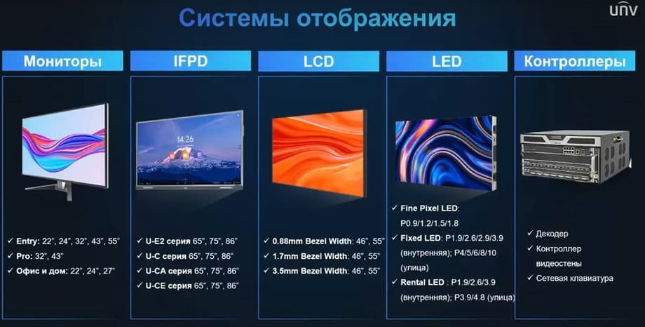 LED video walls are built a little differently, they are a little more expensive, but they are considered more high-class devices specifically in video display systems. They are used to build large video walls, flight control centers, etc. They can be both internal and external. Internal LED video walls start with a pixel pitch of 0.9 mm, then more, and reach outdoor video walls with a pixel pitch of up to 10 mm, with a brightness of 10 thousand candelas per square meter, i.e. very bright outdoor panels. There are also models for rent, when you need to quickly assemble a video wall, quickly disassemble it, load it into cases and transfer it to a new place. There are also controllers and decoders. Controllers process standard signals from n number of some HDMI, DVI, Display Port devices to n number of LCD panels that can be connected to this controller. That is, the customer tells you how many independent input sources, sources of information, he will have, and how many monitors he needs to turn on and display all this. Accordingly, you will fill these controllers with cards. The chassis will insert one or another type of cards that the customer requires. As for decoders, they allow you to work specifically with video data streams from a video camera or from a video recorder. Here we do not work with standard HDMI signals, display ports and so on. Here we take a stream from the camera or from the recorder, and already decode it into an image on the standard output interface on board the decoder itself. We also have network keyboards in the control system controller.