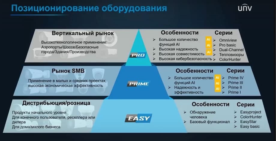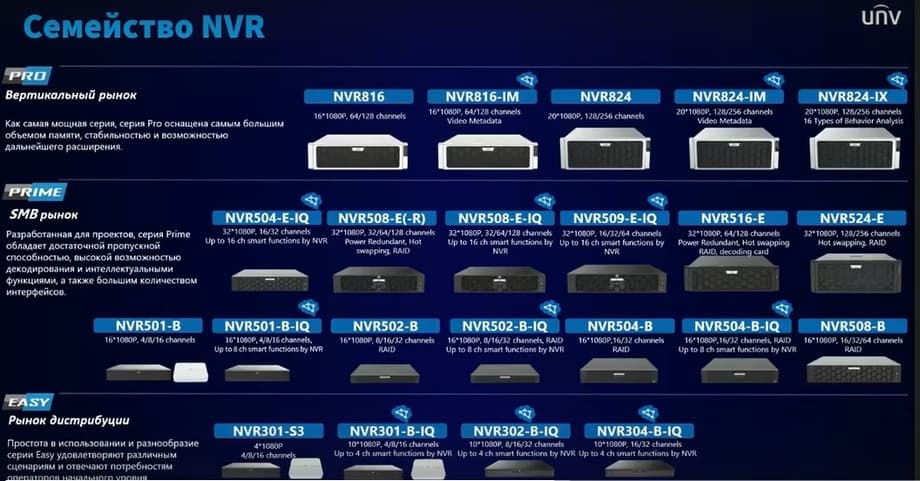 The Easy series is designed for distribution, for retail, for the end user. The Prime series is recommended for small and medium-sized businesses. This applies to both cameras and recorders. And the Pro series is designed for large vertical solutions, for large projects with their own specific features.