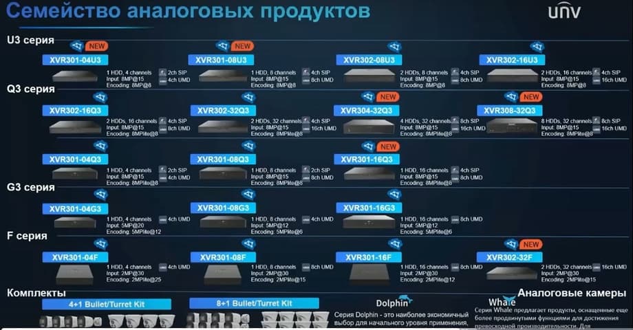 We have hybrid video recorders that allow you to connect from 4 to 32 cameras via coaxial cable from one hard drive to eight. Also, on all hybrid recorders there is an icon, such a polygon, which indicates that the recorders can do something with the video analytics that are on their own board from the usual analog video stream. We also have analog multi-format cameras and plus kits.