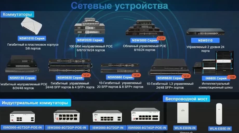 These are L2, L3 level switches, aggregation switches and core switches. If we talk about core switches, then they are made in the form of a chassis, where we insert the necessary cards with the necessary interfaces that are used on the object. Uniview has wireless bridges that allow, conditionally speaking, to connect a camera located on one bank of the river with a recorder located on the other bank. The big plus is that with such a connection you do not need to configure wireless bridges, an access point, this is all configured at the factory. In Russia, you can do this with the help of third-party vendors, but at the same time you need to climb into each access point, configure ports and so on. Uniview has done this at the factory, so turn it on and use it. A quick solution for such tasks. Up to 3 kilometers is supported, of course, in direct visibility.