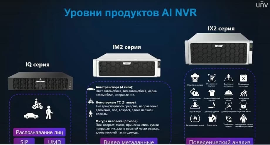 Here their capabilities are clearly shown. IQ series: face recognition, perimeter protection, smart intrusion prevention (SIP) and ultra-motion detection (UMD) are supported. The IM2 series is the PRO series of recorders, this is working with video metadata. It is simply not drawn here, but there is also face recognition, perimeter protection, ultra-motiondetection is also present, but on a much larger number of channels than in the IQ series and allows video metadata to highlight some interesting attributes of a person, a car and a non-motorized vehicle that you see in the slide, for subsequent quick search in the archive.