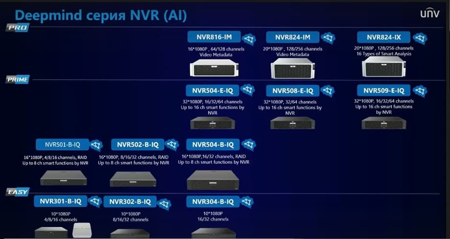 We called it the Deepmind series. That is, these are the same recorders that you saw on the previous slide, they are simply placed in a separate line. We called it Deepmind, which means a smart recorder. In the Easy series, recorders can also recognize faces, not for the full number of channels. Perimeter protection is also not for the full number of channels. In this diagram, we want to visually present a diagram of existing video recorders specifically with analytics on board. One level in the Easy series, B-IQ, two levels B-IQ and E-IQ in the Prime series and one level in the Pro series. Each level has the same encoding capabilities for the corresponding series. Just in case, Uniview has some bookmarks from the point of view of hardware. As you can see, there are models with 9 hard drives, which is not the standard. The standard is considered 1, 2, 4, 8, 16, 24 and 32 hard drives. We have models that have 9 hard drives as well and this can be a good bookmark in the project.