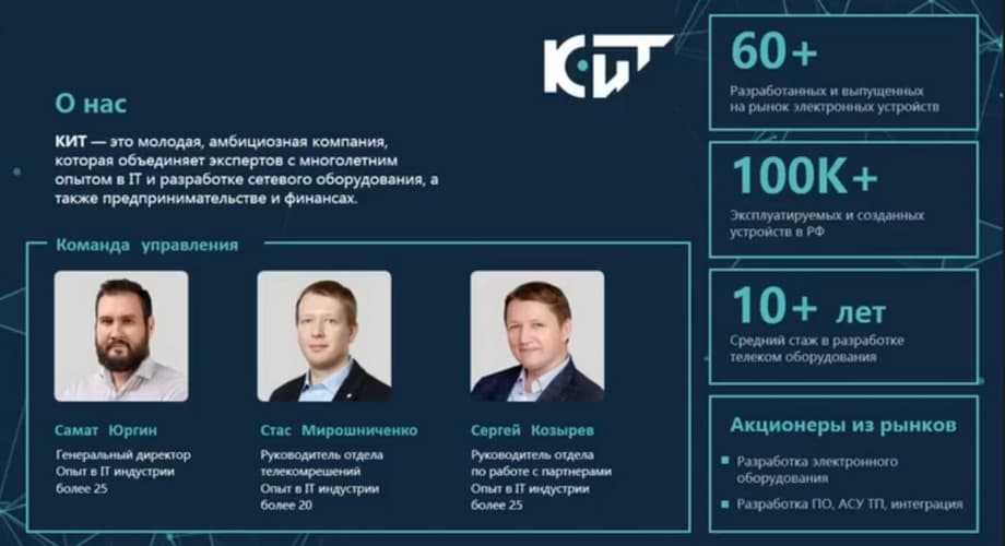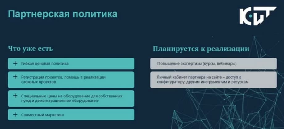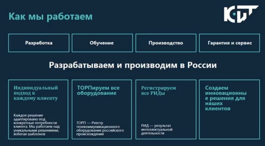 On the one hand, we are not reinventing the wheel, since we have a lot of experience working in different companies, both large and small, both Russian and foreign, so we take the best practices, adapt them to the Russian market and to our vision. The company is based on its own development. KIT itself formed a legal entity, a Moscow office, only last year, but our development department has been on the market for more than 10 years, and has developed many devices during this time. All our developments are purely Russian, although our competitors felt what we were doing and how well we were doing it, and information began to come to us that they were trying to discredit us in every possible way. We have our own development, a large team. The development itself is located in Ufa. We have contract manufacturing. There are enough factories in Russia that can produce electronics. Many of them are underutilized and are happy to help companies like us to implement our ideas and produce equipment with the required quality and on time. Therefore, there is no point in making our own production. We will not be able to compete with them in quality, so we prefer to take the best from the market. We, as a real vendor, provide warranty and service for our equipment, since we develop it ourselves, we know where, what and how can go wrong, and how to fix it. Training courses are currently being developed for the channel, for the market, for customers, for partners. Since we are looking to the future, the courses are being developed on the basis of the standards of the Ministry of Education, and these courses should in one way or another be adopted in educational institutions and become part of the curriculum for relevant specialists. And, as you know, mandatory requirements for the development of such courses will be introduced for companies from September.