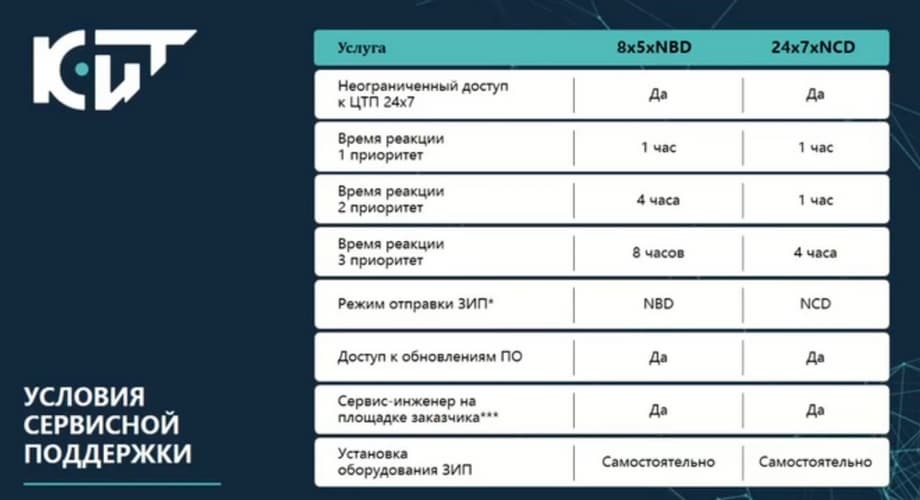 So far, there are only two programs, standard 8x5xNBD and 24x7xNCD, here the abbreviation NCD is a little non-standard, it is Next Calendar Day, that is, not a business day, but we undertake that we will send the equipment as quickly as possible when the service is purchased. As part of these two programs, a service engineer will be available. All the details of the service program under warranty will be published on the website. We have a test page ready. You need to make it "on". But for now, at this stage, the departure of a service engineer will be paid separately, because it is not clear where to go and how. Service and warehouses are now provided from two locations, from Ufa and from Moscow. Therefore, we will choose the nearest point to provide ZIP. Our plans are to develop a network of service centers either on the basis of partners or on the basis of simply authorized service centers.