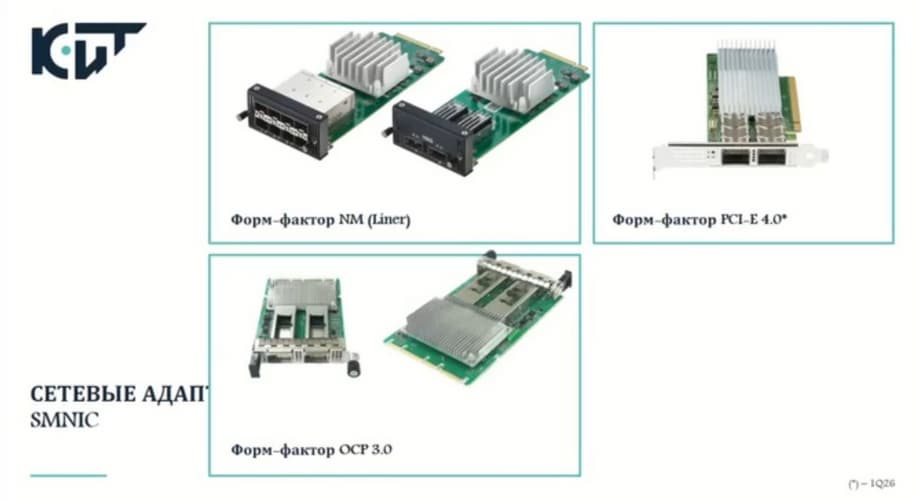 The S2158 series are full-fledged L3 switches with redundant power supplies, with full routing. We also plan to develop a series of switches for data centers. It is clear that the requirements for these switches are significantly different both in terms of functionality and hardware. Therefore, all this will be in 2026 and beyond. There will be three series. We are focusing on the classic Leavespine factory, so ports from 10 to 25 gigabits and up to 400 gigabits will be present there. Simple L2 switches should also appear by the end of this year. When you need cheap, fast, but serious. Additionally, just for customers, for partners who are just supplying ready-made equipment and its implementation, integration work is less interesting, but nevertheless network adapters for network appliances and for servers. Right now there is the SMNIC2810 series in the form factor, liners, and there is already one card in the UCP 3.0 format with normal overall dimensions that allow it to be installed in a standard slot.