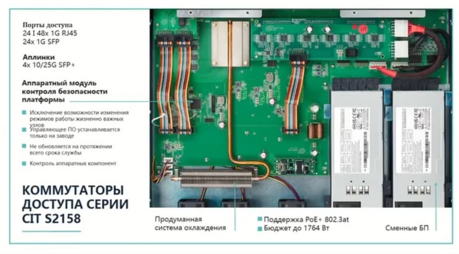 We now live in a world where many attacks are committed every day. In April, we were at an event organized by telecom operators, and each operator complained that they were being attacked, and they were being attacked not just like that, the equipment was being disabled by various methods. And they told cases of how it all happens. And when one of the cases that was highlighted was told, it was infected SFPs. This is the easiest way to put down the internal bus. SFP with ordinary malware. Many, as you know, already have smart SFPs with built-in processors on these SFPs, where there is practically a built-in server. Therefore, you can implement different threats and hacking methods. And our module serves to block such activities aimed at working with internal buses, transmitting data over these internal buses. That is, no matter what the user plugs into the switch, this malware will not be able to reach these internal buses, thanks to our module. It will control everything and will not allow the code to be executed. Let me give you a simple example. The buses were overloaded - it just didn't work, they gave some command. Our power supplies are smart, they gave the power supply a command to stop the fan, it heated up, a fire broke out, as a result of which the rack burned out. So it's very easy to do. We don't have such scenarios. Our equipment will survive such attacks in any case.