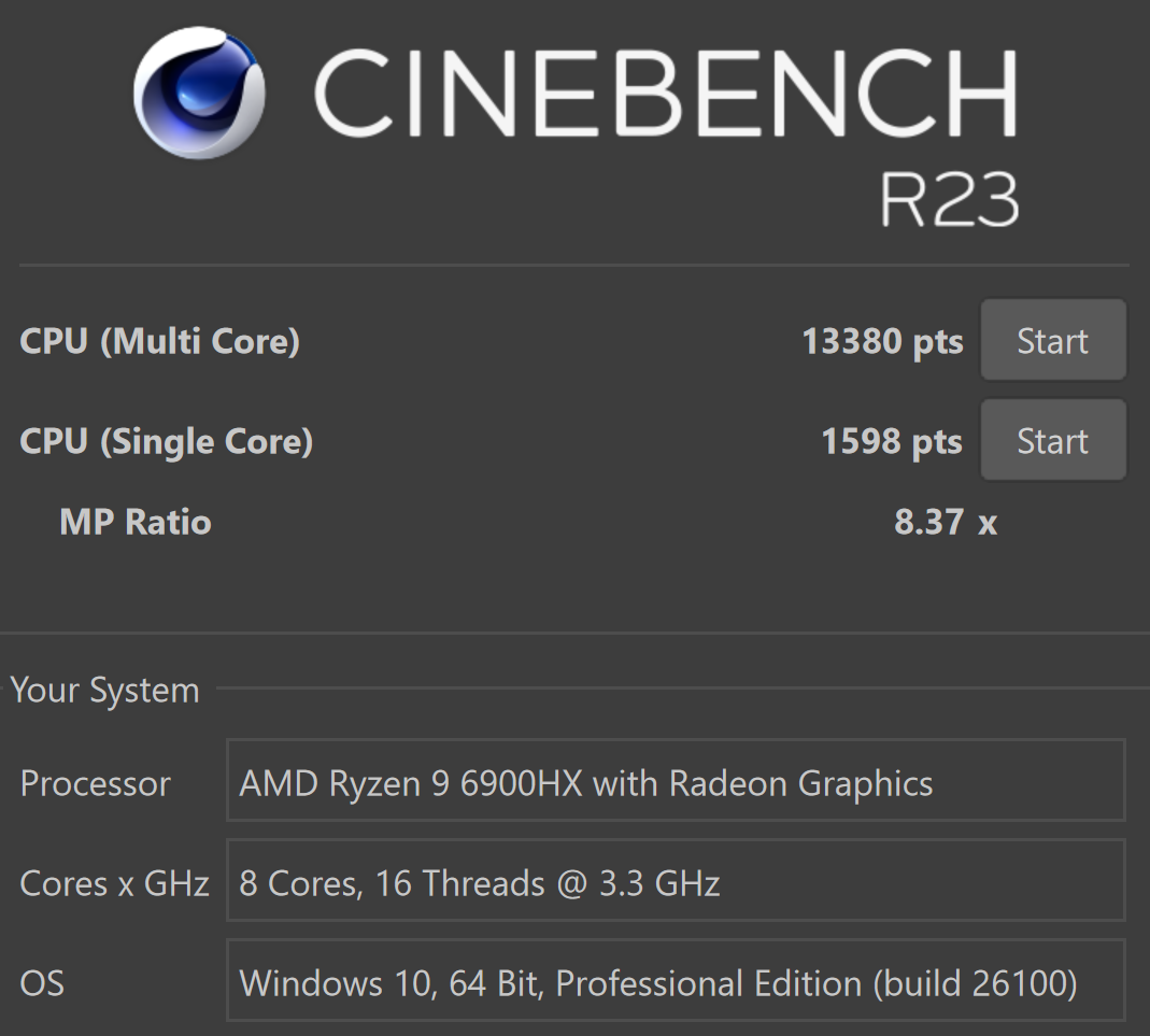 Processor: AMD Ryzen 9 6900HX (Zen 3+, Rembrandt): 8 cores / 16 threads; 3.3 - 4.9 GHz (max. boost), TDP 45 W.