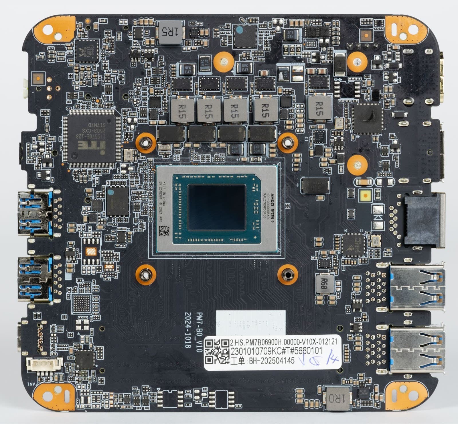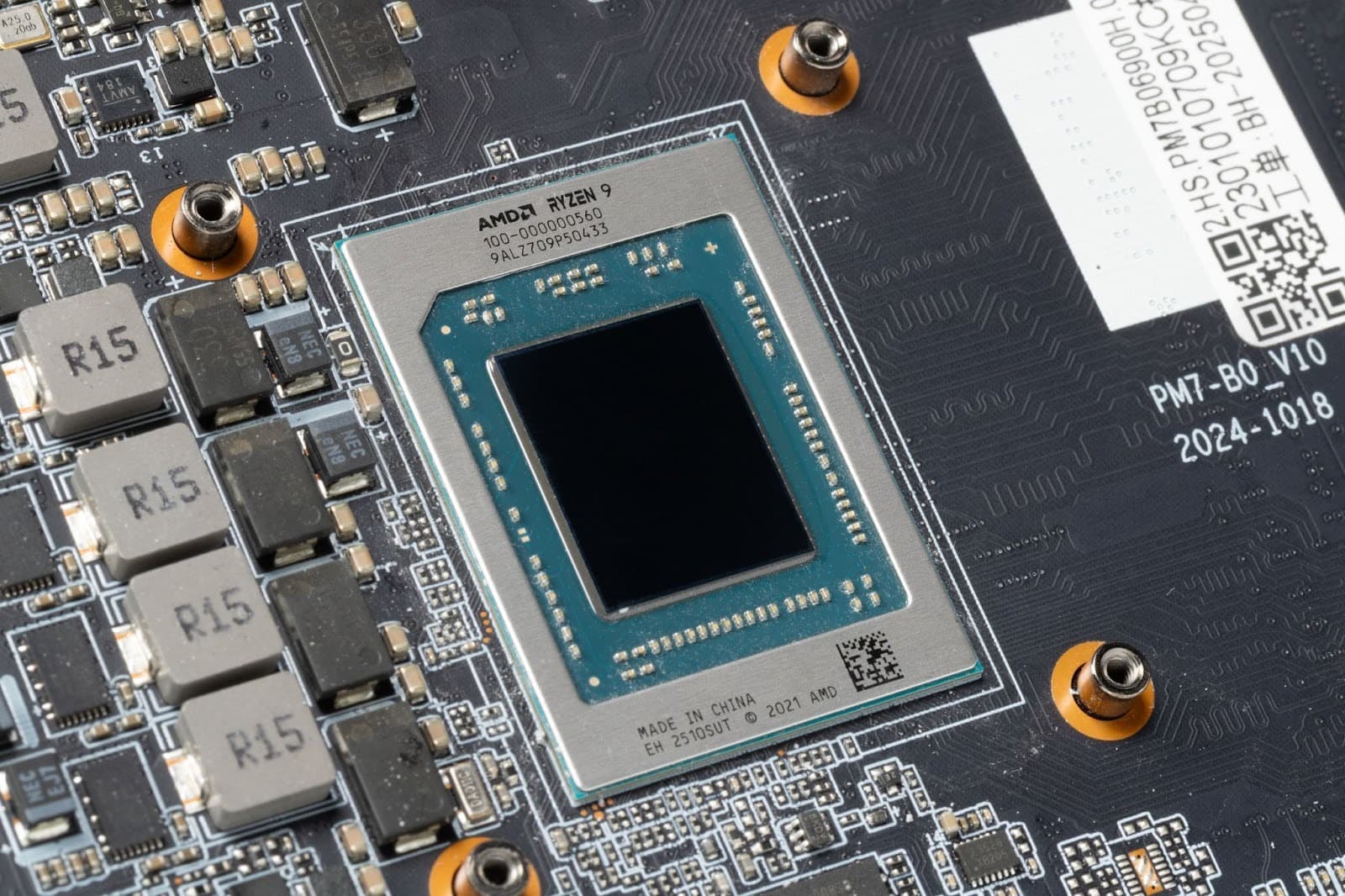 In the center is soldered an AMD Ryzen 9 6900HX processor, built on the Zen 3+ (Rembrandt) architecture. Like all AMD mobile chips, it is made in a BGA package and soldered directly to the board.