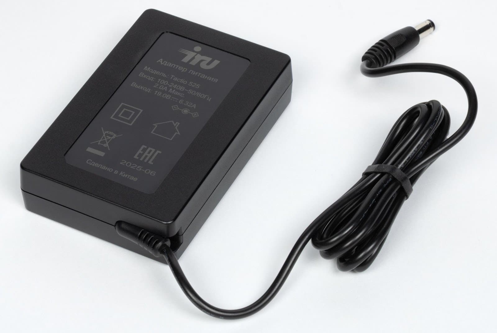 The iRU Tactio 525 comes in a white box made of dense cardboard with a hinged lid, on which the name and image of the device are applied. Inside, the PC itself and its components are securely fixed with cardboard inserts.
