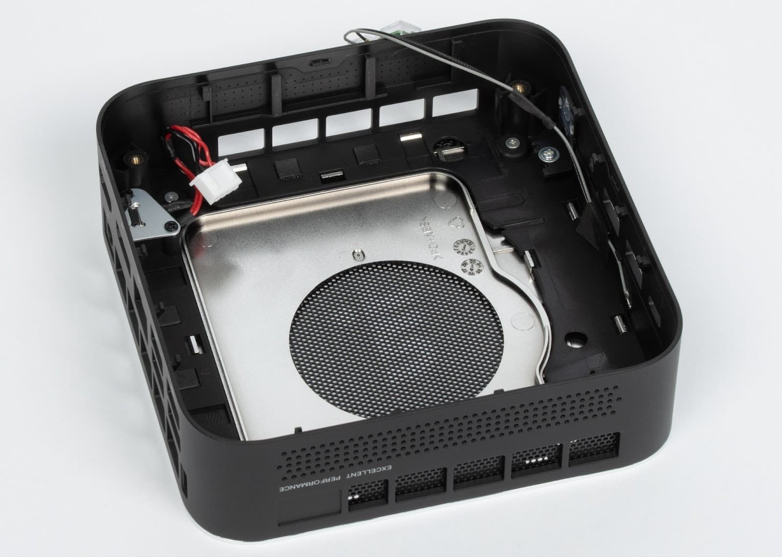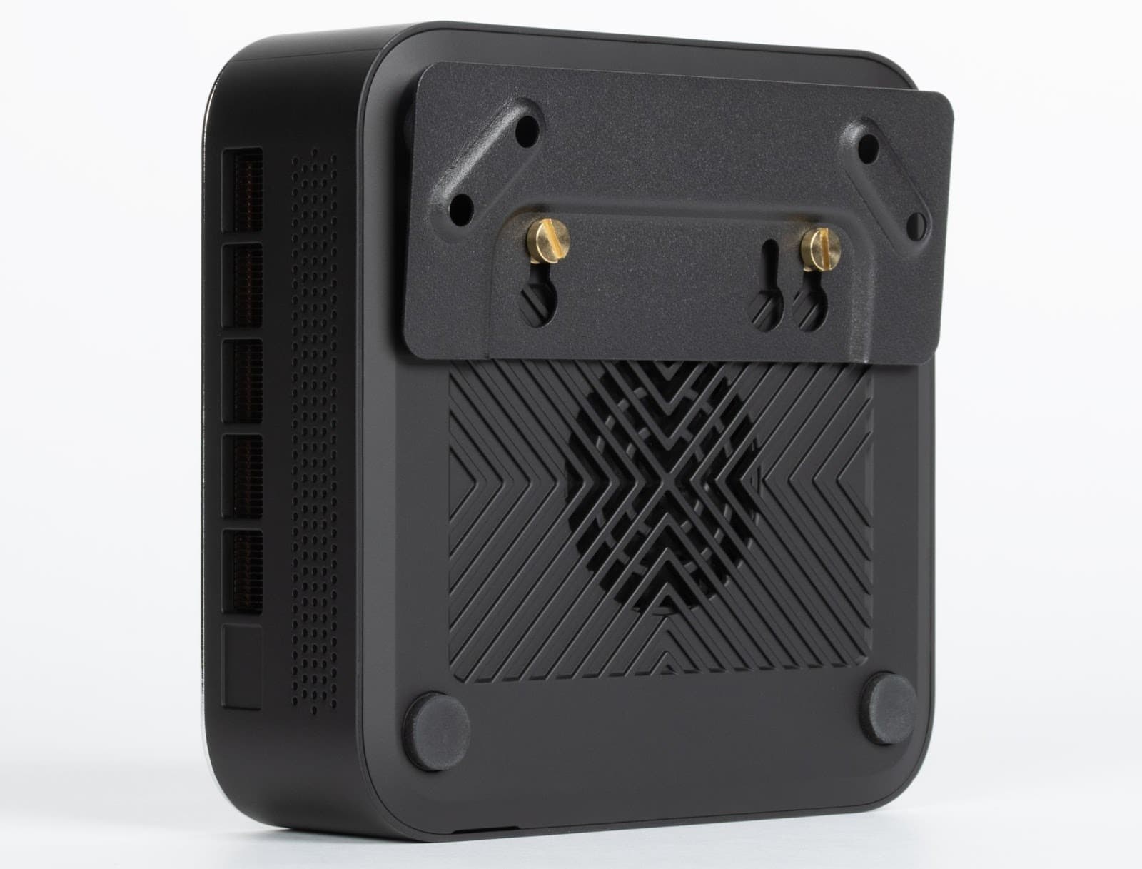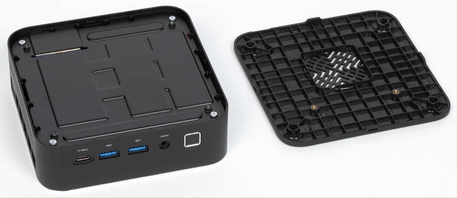 The bottom panel of the mini-PC is attached to the case with four screws hidden under rubber feet.