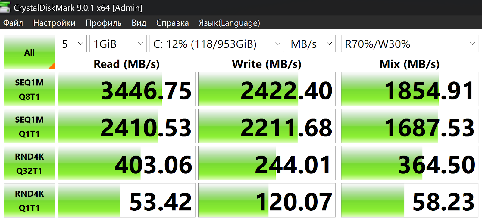 In the CrystalDiskMark 9.0.1 test, the drive showed up to 3446 MB/s when reading and about 2420 MB/s when writing. When working with large files - exporting video or batch processing RAW - this provides a stable and predictable speed without noticeable drawdowns. Random access indicators at the level of approximately 400 MB/s when reading and 240 MB/s when writing confirm good responsiveness in real tasks: Windows boots in a few seconds, and applications like Photoshop or Lightroom open quickly and without delays.