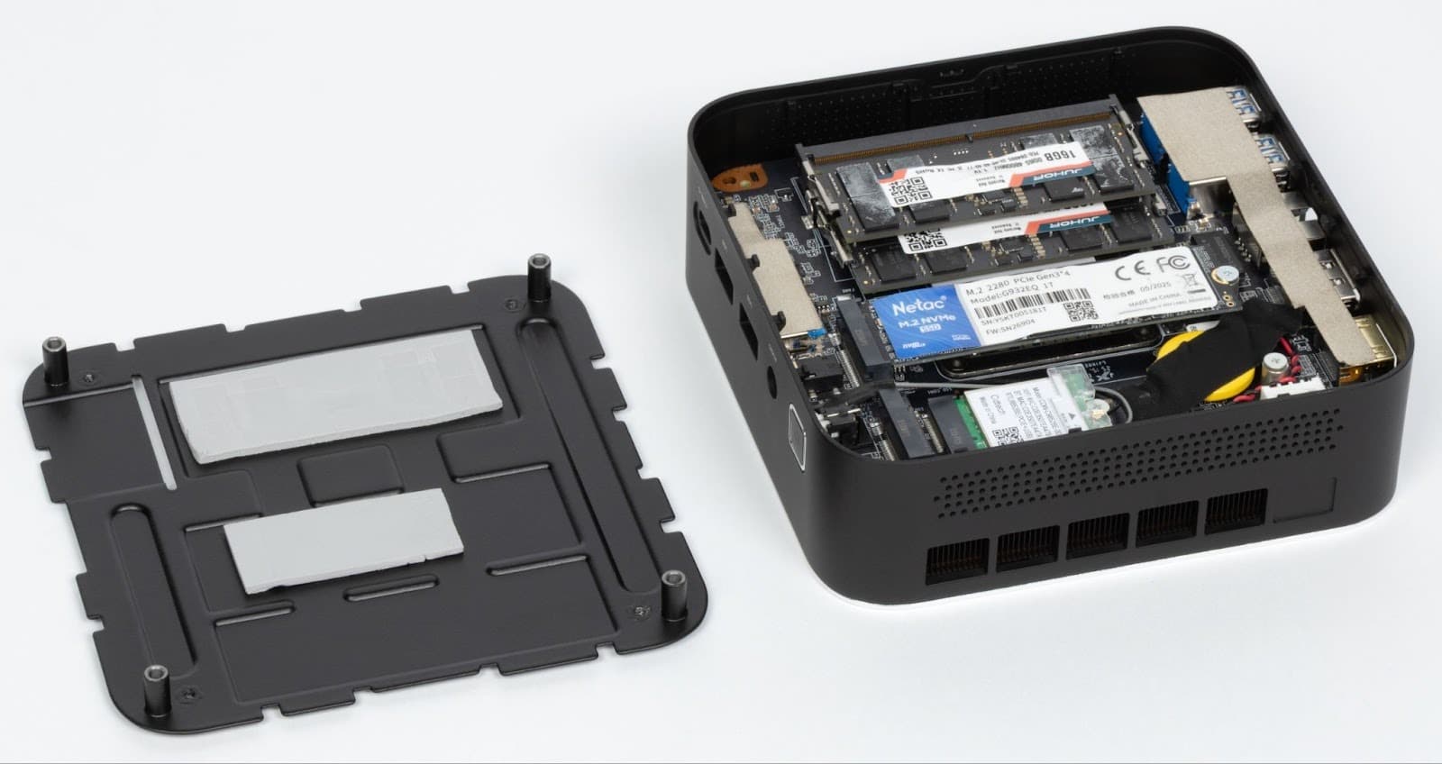 After removing it, we get access to the second - metal - cover with the same mount. It is also easily dismantled. On its inner side there are two thermal pads that are in contact with the memory modules and SSD. Against this background, the presence of a ventilation hole in the plastic part of the bottom looks quite justified.