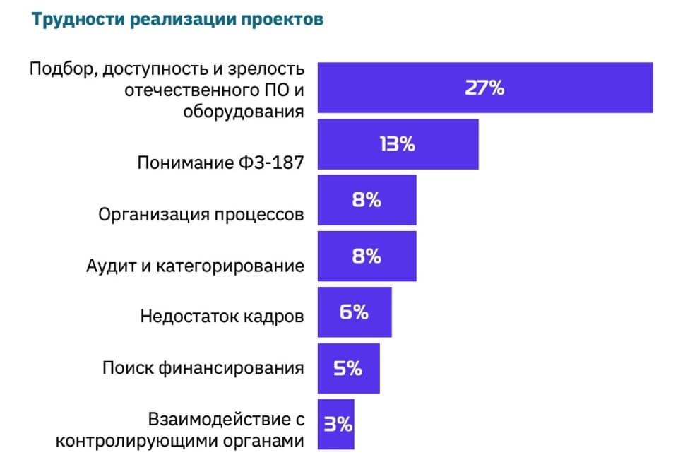 The category of CII entities includes enterprises whose disruption could lead to the failure of transport infrastructure, communication networks, public services, and damage to the life and health of people. The main goal of Federal Law No. 187-FZ is to protect the IT systems of government agencies, banks, industry, medical institutions, and other companies from cyberattacks. Although the law was adopted in 2018, 35% of respondents are still at the start of the project implementation. Only 7% of companies have fully completed it.