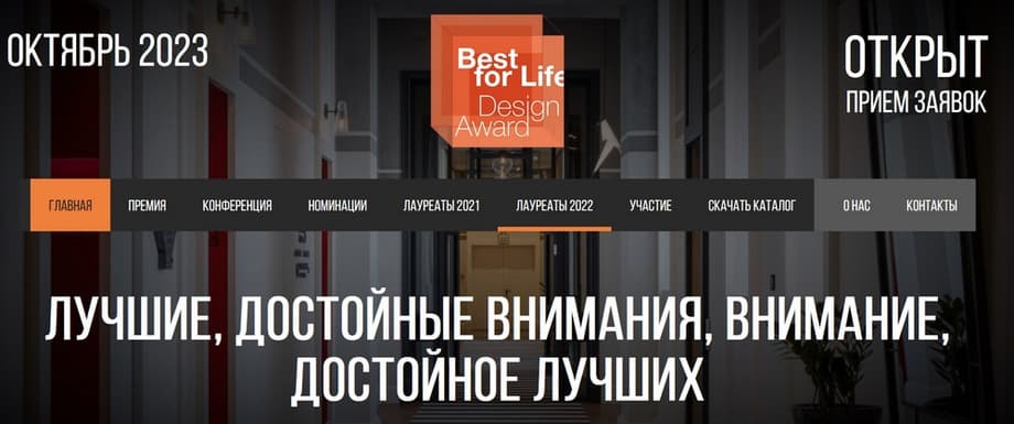 The mission of the Best for Life Design Award is to emphasize the importance of creating a comfortable, environmentally friendly, and innovative environment for living and working spaces, and to identify companies that provide the market with high-quality goods and services from a design perspective. The Award features 5 blocks – Product & Promotion, Spaces & Places, Green Design, Digital Design, Art & Design, each with a large number of nominations. The winners in each nomination will be determined by recognized experts from the world of design – founders of successful design bureaus, art critics, heads of design and architecture departments of higher education institutions and industry associations.