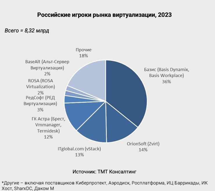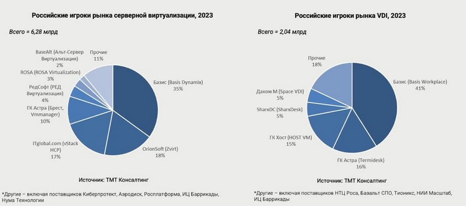 Analysts at TMT Consulting have for the first time assessed the structure of several market segments at once by key players — software developers. Thus, the share of "Basis" in the VDI segment amounted to 41%, in server virtualization — 35%.