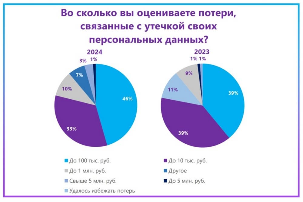 The study showed that Russians continue to face financial losses as a result of leaks. The number of citizens who noted damage in large amounts (from 100,000 to over 5 million) in different categories either increased or remained at the same level: 46% of respondents estimated their damage at 100,000 rubles, which is seven percentage points more than in 2023. The share of those who reported losses of up to one million rubles increased (10% versus 9% a year earlier). Also this year, 1% indicated damage of up to five million rubles, and another 3% reported losses of over five million rubles.