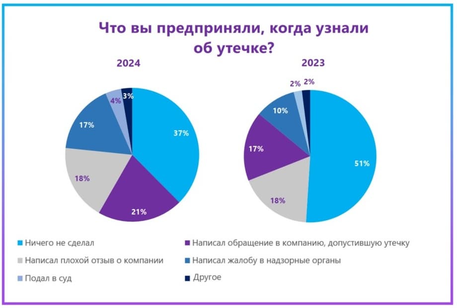 In 2024, the number of those who actively respond to personal data leaks has increased. Thus, 21% of Russians contacted companies that allowed the leak, compared to 17% in 2023. Citizens began to file complaints more often with supervisory authorities (an increase from 10% to 17%), and lawsuits in court (an increase from 2% to 4%). Russians are becoming more aware of what can be done to protect their data. In 2024, three percent of respondents chose the "Other" item, where, among other actions, people mentioned changing passwords, blocking and reissuing bank cards, installing two-factor authentication, and deleting accounts from services that allowed the leak.