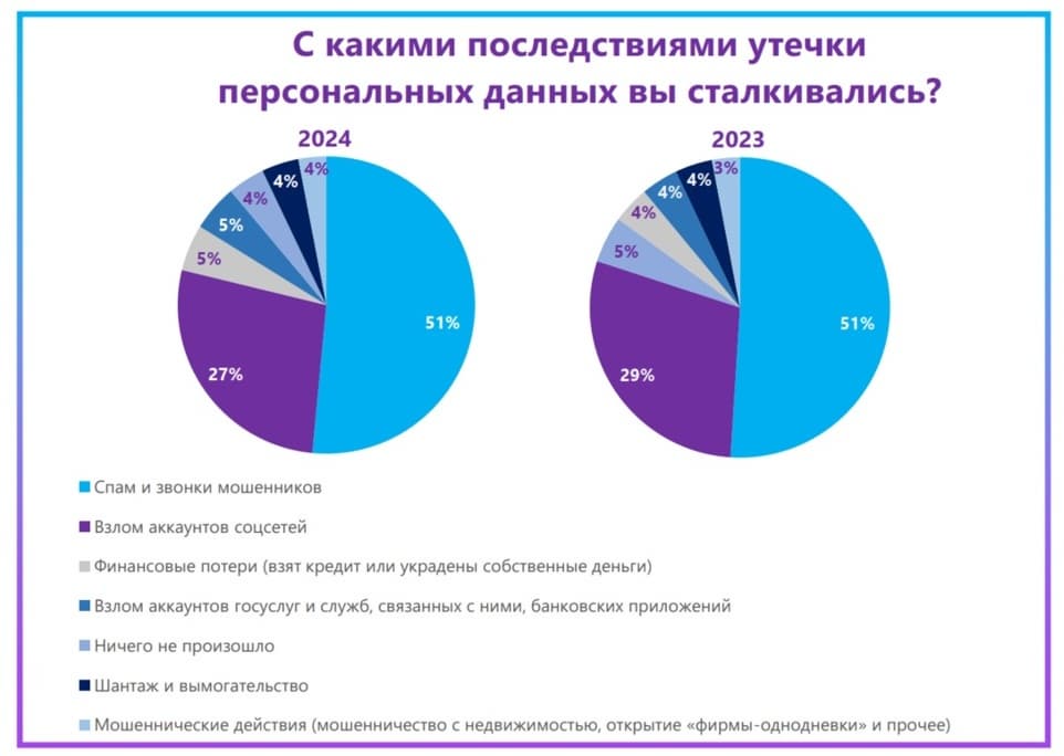 In 2024, 51% of respondents reported that as a result of personal data leaks, they began to receive more spam and calls from fraudsters, which is similar to the 2023 figure. This year, linear employees (54%) suffer the most from spam, while a year ago it was pensioners (63%). This may be due to the development of digital services, which older people use less. People with more wealth are more likely to encounter the financial consequences of the activity of attackers.