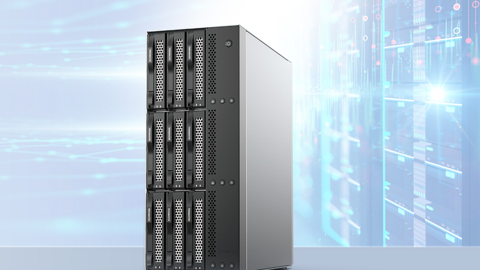 The all-metal enclosure features an unusual design with nine physical power switches and a main control switch. Thus, unused drives can be turned off independently of the others, reducing power consumption by up to 70%. The intelligent UPS power-off protection system automatically parks the heads and protects the data cache in the event of sudden failures.