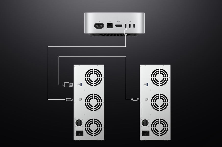 The device is equipped with a USB 3.2 Gen2 interface. D9-320 is compatible with USB 3.0/3.1/3.2, USB 4, Thunderbolt 3, and Thunderbolt 4 ports. Mixed installation of 3.5\" and 2.5\" HDDs and SSDs is supported. An additional USB Host expansion port with a bandwidth of 10 Gbps is provided, allowing multiple storage devices to be connected in a chain.