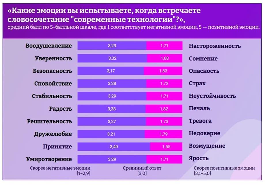In general, most Russians still belong to the conditional "techno-optimists" - they assess the impact of information technologies rather positively. 61.5% of respondents believe that IT solutions are beneficial, the proportion of those who are not concerned about the implementation reached 42.6% (increased by 3.1 percentage points). It is important that no negative emotions are recorded in any of the perception ranges.