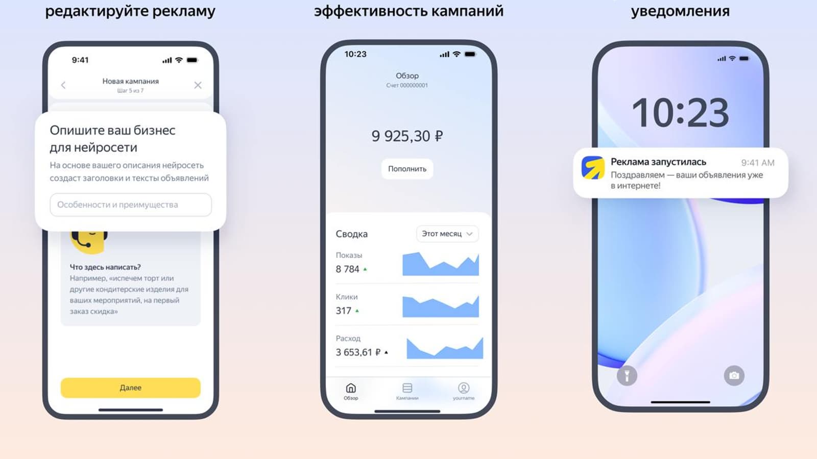 The application allows entrepreneurs to launch and control advertising campaigns directly from their smartphone. Promotion is possible without a website — clients can be directed to the company's card in "Maps" or receive requests by phone or in messengers.