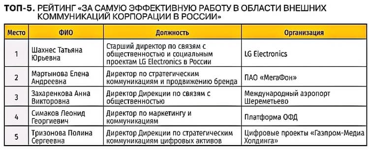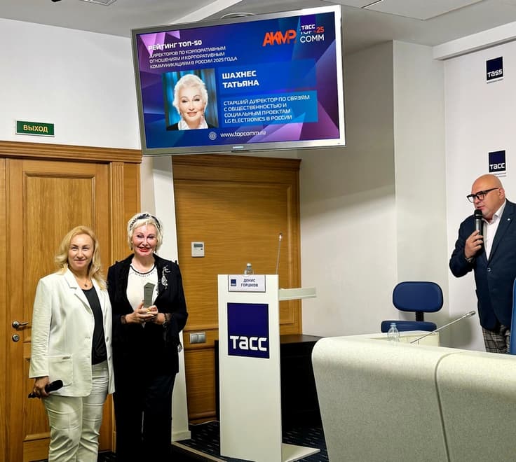 The first place in the category "For the most effective work in the field of external communications of the corporation in Russia" was awarded to Tatiana Shakhnes, Senior PR) ESG Director at LG. In the nomination "Best Department in the Field of Corporate Relations in Russia," LG received fifth place.