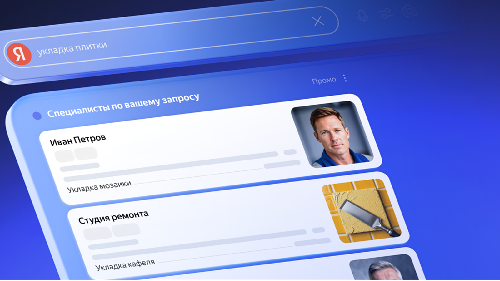 If a user is searching for services, a gallery with relevant ads may appear on the Yandex search results page. If necessary, you can call or write in a messenger directly from the card, go to the specialist's profile in the aggregator service or to the company's website, and find out the details there.