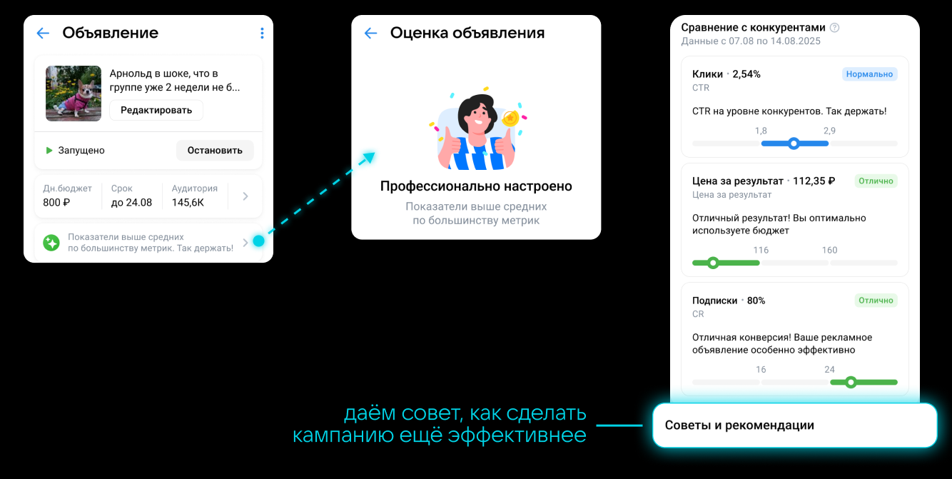 The functionality will be useful for both experienced VK Ads users and beginners. Comparison with competitors will not only clearly explain how good or bad the indicators are, but also give clear guidelines for improving advertising campaigns: it will identify weaknesses and show possible growth points. Advertising optimization will become clearer and will allow you to use competitive analysis to achieve better results with each launch.