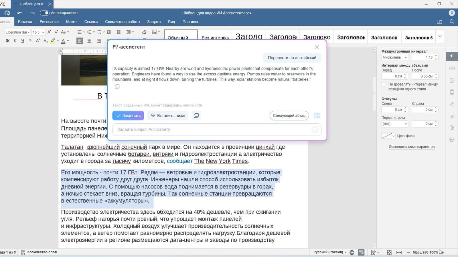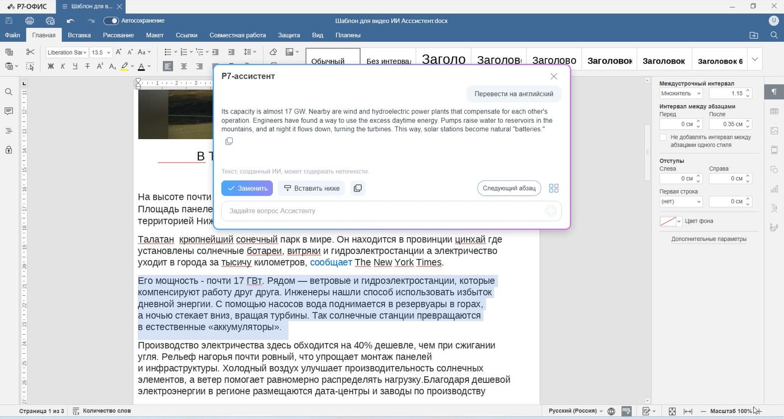 R7-Assistant is integrated into document editors and provides text processing capabilities such as intelligent proofreading, highlighting key ideas, translation into various languages, and much more.