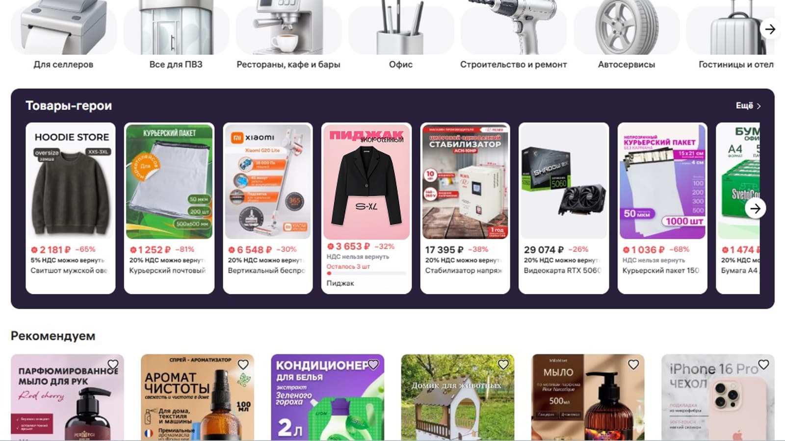The showcase features millions of product items from nearly 80 categories, ranging from office supplies and professional equipment to products for restaurants, beauty salons, and car services. The goods are grouped by thematic areas depending on the needs of a particular type of business: "Restaurants, Cafes and Bars", "Office", "Cleaning", "Medical Organizations", "Hotels", "Car Services", "For Study and Creativity" and others. In addition, there are separate sections on the showcase with goods for sellers and owners of order pick-up points.