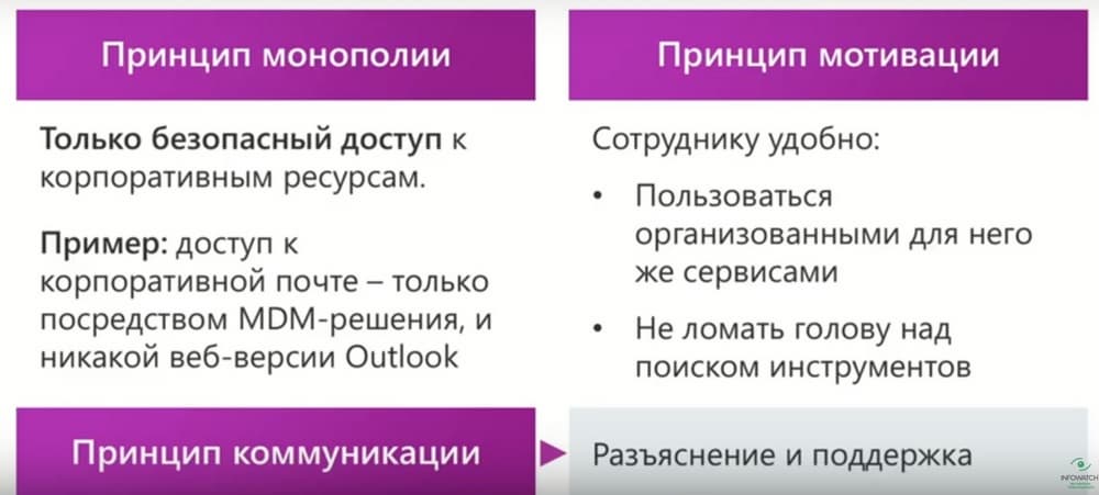 Принцип монополии означает только безопасный доступ к корпоративным ресурсам. Например, доступ к корпоративной почте только посредством MDM-решений и никакой вэб-версии Outlook. Принцип мотивации заключается в том, что сотруднику удобно пользоваться организованными для него уже сервисами и не ломать голову над поиском документов. Конечно, необходима коммуникация, т.е. разъяснение и поддержка процесса работы с соответствующими программными решениями. Идея концепции защищенной витрины заключается в том, чтобы использовать личные мобильные устройства сотрудников для безопасного и контролируемого доступа к информационным ресурсам компании. Но при этом корпоративные данные, работа с которыми происходит через смартфон или планшет, невозможно сохранить во внутренней памяти устройства. В то же время, личная информация пользователя недоступна для соответствующего приложения. Т.е. это как раз то, что нужно в условиях дистанционной удаленной работы.