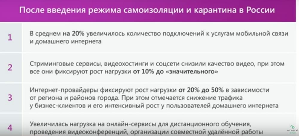 Какую сейчас можно увидеть картину? В среднем на 20% увеличилось количество подключений к услугам мобильной связи и домашнего Интернета. Стримминговые сервисы, видеохостинги, соцсети вынуждены были снизить качество видео, и при этом они фиксируют рост нагрузки от 10% до весьма значительных цифр. Интернет-провайдеры фиксируют рост нагрузки от 20% до 50%, причем отмечается мигрирование нагрузки со стороны бизнес-клиентов в сторону пользователей домашнего Интернета. Также увеличилась нагрузка на онлайн сервисы для дистанционного обучения, проведения видеоконференций и организации совместной удаленной работы. Понятно, что далеко не все пользователи работают дома, часть из них находятся в отпуске, многие остались без работы и коротают время самоизоляции за компьютерными играми и просмотром фильмов. Ну а школьники и студенты активно используют ресурсы и средства для дистанционного обучения, что также привело к росту нагрузки на сеть. Соответственно члены семьи находятся дома, активно используют Интернет, что приводит к росту определенных угроз, поскольку злоумышленники активно перемещаются вслед за пользователями.