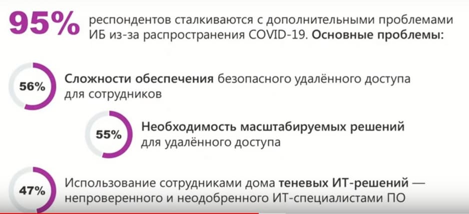 Основные проблемы следующие. 56% отмечают сложность обеспечения безопасного удаленного доступа для сотрудников; 55% - необходимость масштабных решений для удаленного доступа и 47% - использование сотрудниками дома теневых IT-решений, непроверенного и не одобренного IT-специалистами программного обеспечения. Суть в том, что в ряде случаев сотрудники, столкнувшись с необходимостью решения рабочих задач со своих личных устройств, стали решать эти задачи, используя личные ресурсы и средства. При этом часто использовались общедоступные и незащищенные ресурсы, например, те же файлообменники, личная электронная почта, соцсети, средства видео- и конференцсвязи. При этом сотрудники далеко не всегда уделяют должное внимание обеспечению безопасности. Например, элементарно установить пароль на доступ к папке на виртуальном жестком диске.