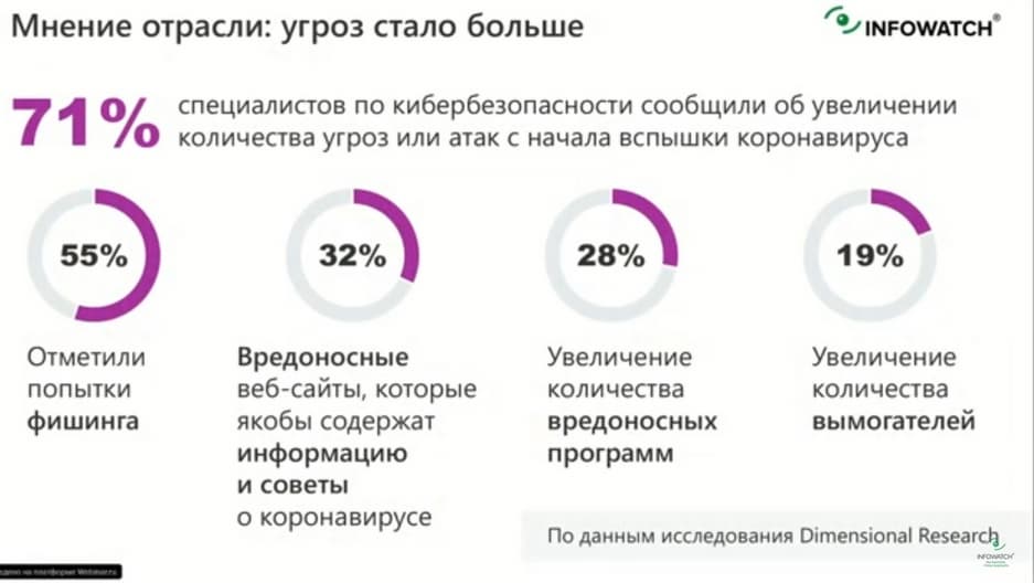 Давайте обратим внимание на следующие цифры: 71% специалистов по кибербезопасности сообщили об увеличении количества угроз или атак с начала вспышки коронавируса; 55% отметили попытку фишинга; 32% - ссылки на вредоносные сайты, которые якобы содержат информацию о коронавирусе; 28% отмечают увеличение количества вредоносных программ и 19% увеличение количества фишинговых ссылок, связанных с вымогательством денег, или попыткой получения доступа к персональным данным.