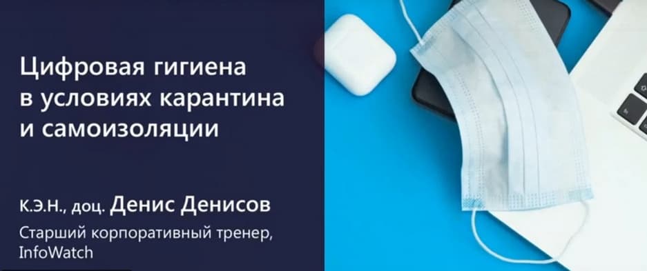 Это мероприятие посвящено актуальной теме соблюдения сотрудниками правил цифровой гигиены в условиях карантина и самоизоляции и вести его будет кандидат экономических наук, доцент, старший корпоративный тренер компании InfoWatch Денис Денисов. Здесь будет сделан акцент на том, как пандемия коронавируса повлияла на единое информационное пространство, какие с этим связаны угрозы и риски, и что необходимо сделать для эффективной защиты и обеспечения безопасности корпоративных и личных данных.