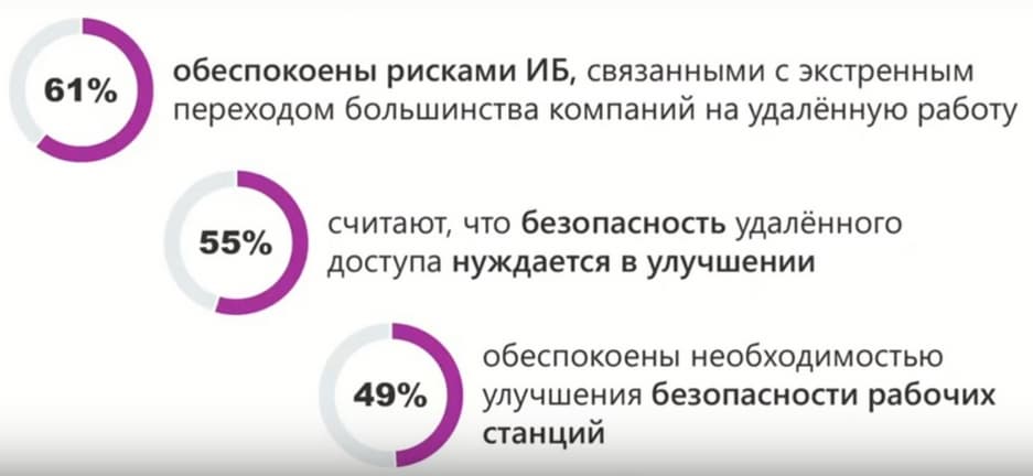 61% обеспокоены рисками информационной безопасности, связанными с экстренным переходом большинства компаний на удаленную работу; 55% считают, что безопасность удаленного доступа нуждается в улучшении и 49% обеспокоены необходимостью улучшения безопасности рабочих станций. Проблема в том, что, когда сотрудник использует для работы личное устройство, даже если на нем все грамотно настроено и защищено, далеко не факт, что на этом устройстве уже не оказалось вредоносного ПО, того же вируса, или шпионского ПО для слежки за пользователем или доступа к его данным. И если такое вредоносное ПО есть, а сотрудник об этом не знает, то с его устройства оно может проникнуть в корпоративную сеть. Причем, это не обязательно заражение. Это может быть и утечка корпоративной информации, о которой сотрудник даже не подозревает. Конечно, эпидемия пройдет, но удаленка будет иметь последствия и послужит серьезным толчком для развития средств и технологий обеспечения безопасной удаленной работы.