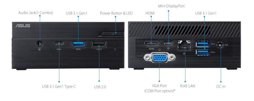 Кроме решетки на ней расположены следующие разъемы: видеовыходы HDMI, miniDP и VGA, сетевой порт RJ-45 со встроенными индикаторами, два порта USB 3.1 Gen 1 (USB 3.0) Type A, вход блока питания. Одной из особенностей компактных моделей от Asus является модульная конструкция и возможность выбора конфигурации некоторых портов. В частности, для PN40 можно заказать установку вместо VGA последовательного порта.