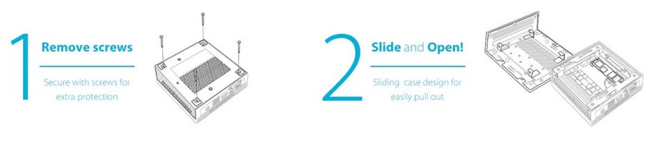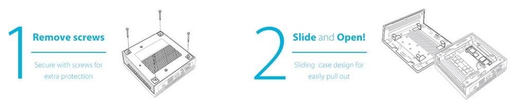 Интересно реализован отсек для накопителей формата 2.5’’ (допустимая толщина – 7 или 9,5 мм) – нижняя часть корпуса сдвигается, на ней диск закрепляется и потом вся конструкция устанавливается на место, так что диск автоматически подключается в соответствующий разъем. Впрочем, честно говоря, использование сегодня накопителей этого формата в компактных системах невысокой производительности представляется не очень востребованным. Возможно стоило отказаться от этого варианта и сделать корпус тоньше.