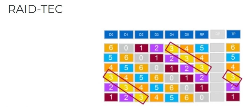 RAID TEC — зарегистрированный тип RAID, обладает тремя дисками четности. Аббревиатура читается как Triple Erasure Coding, а TP — как Triple-Parity. В подобной RAID-группе имеются три диска четности. Первый носит название Row Parity, что значит «четность по горизонтали», имя второго — DP (Double Parity или Diagonal Parity), третий именуется — AP (Anti-Diogonal Parity).