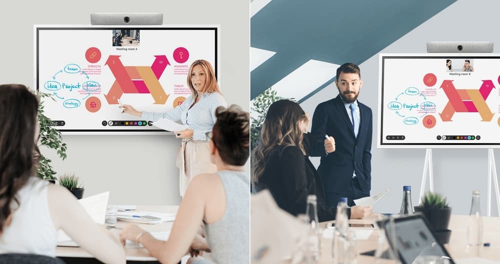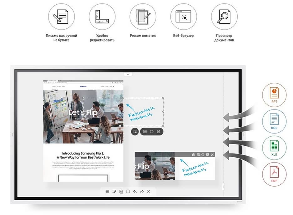 Цифровой флипчарт Samsung Flip — интуитивное и простое в использовании устройство для презентаций, дискуссий, мозговых штурмов и иных разновидностей совместной работы. Устройство снабжено программной оболочкой с развитыми средствами рукописного ввода, рисования, редактирования изображений, а также вывода на интерактивный экран контента с внешних источников с возможностью его дальнейшей правки. Широкоугольная камера Webex Room Kit Mini обеспечивает захват высококачественной картинки на близком расстоянии, а массив умных микрофонов усиливает речь и очищает её от помех. Вдобавок устройство обеспечивает надёжную синхронизацию видео- и аудиопотоков.